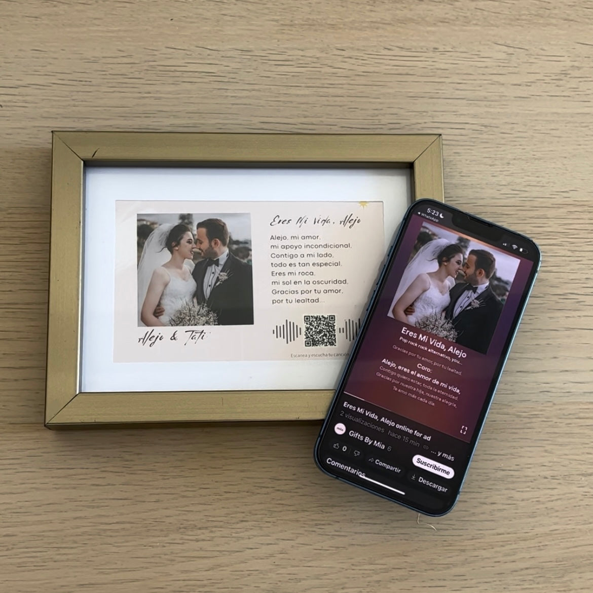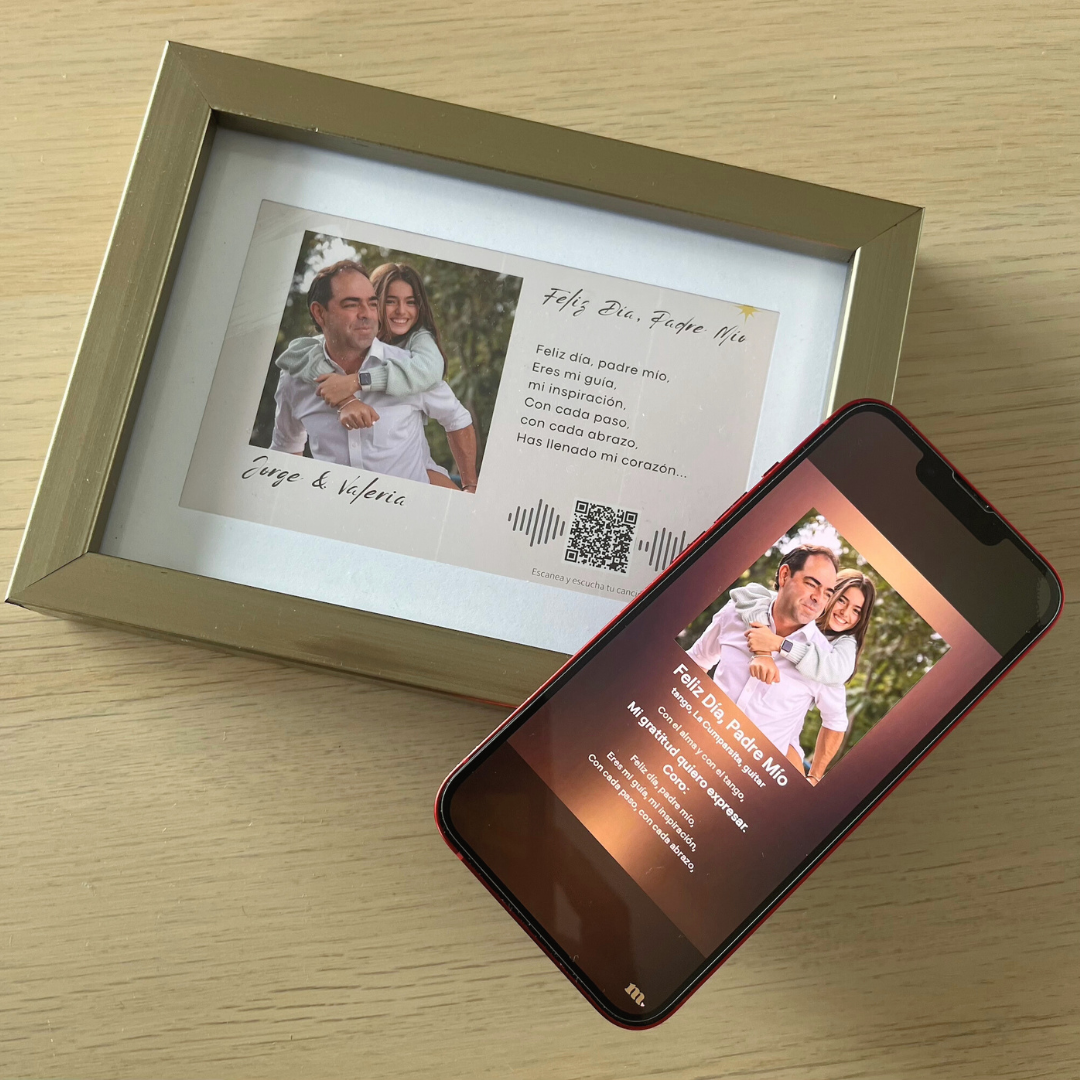La imprimimos junto a tu foto en un marco hermoso, con un código QR para que escuche la canción cuando quiera.