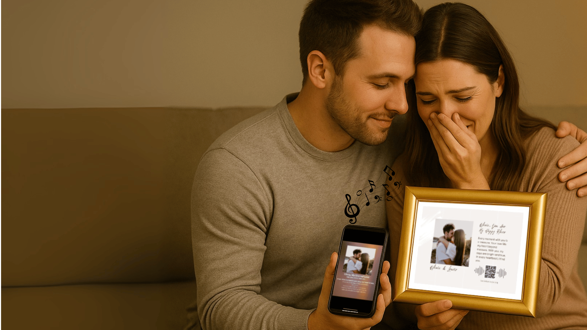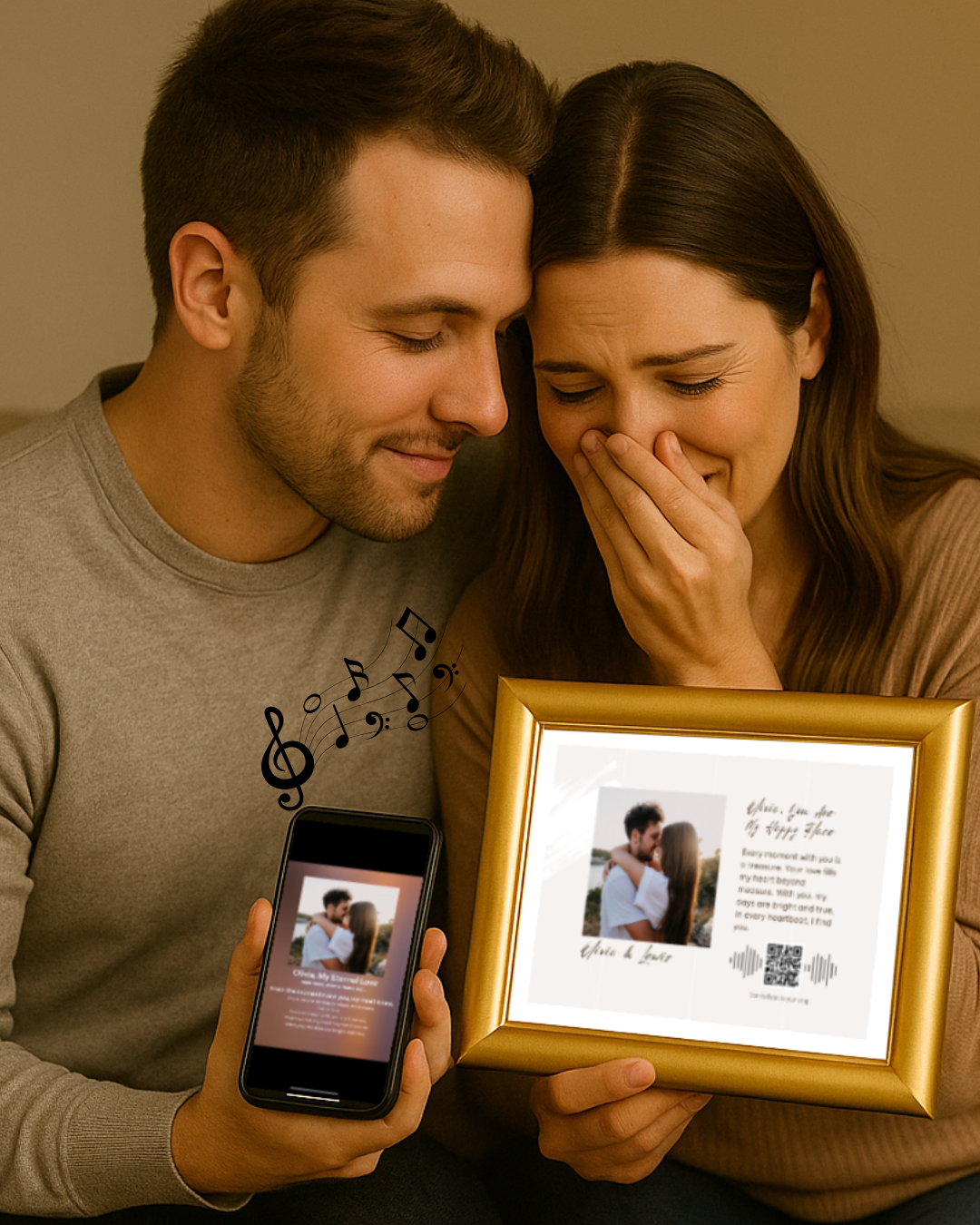 These aren't mass-produced items; each one is created individually, with the care and dedication your story deserves. Our creators, blending AI innovation with genuine human talent, weave a unique melody from your memories and feelings. While AI forms the foundation, the rhythm and emotion are precisely adapted to what you wish to express. The result? A one-of-a-kind melody that speaks directly to the heart, framed alongside your most cherished photo and a QR code that plays it instantly, anytime, anywhere.